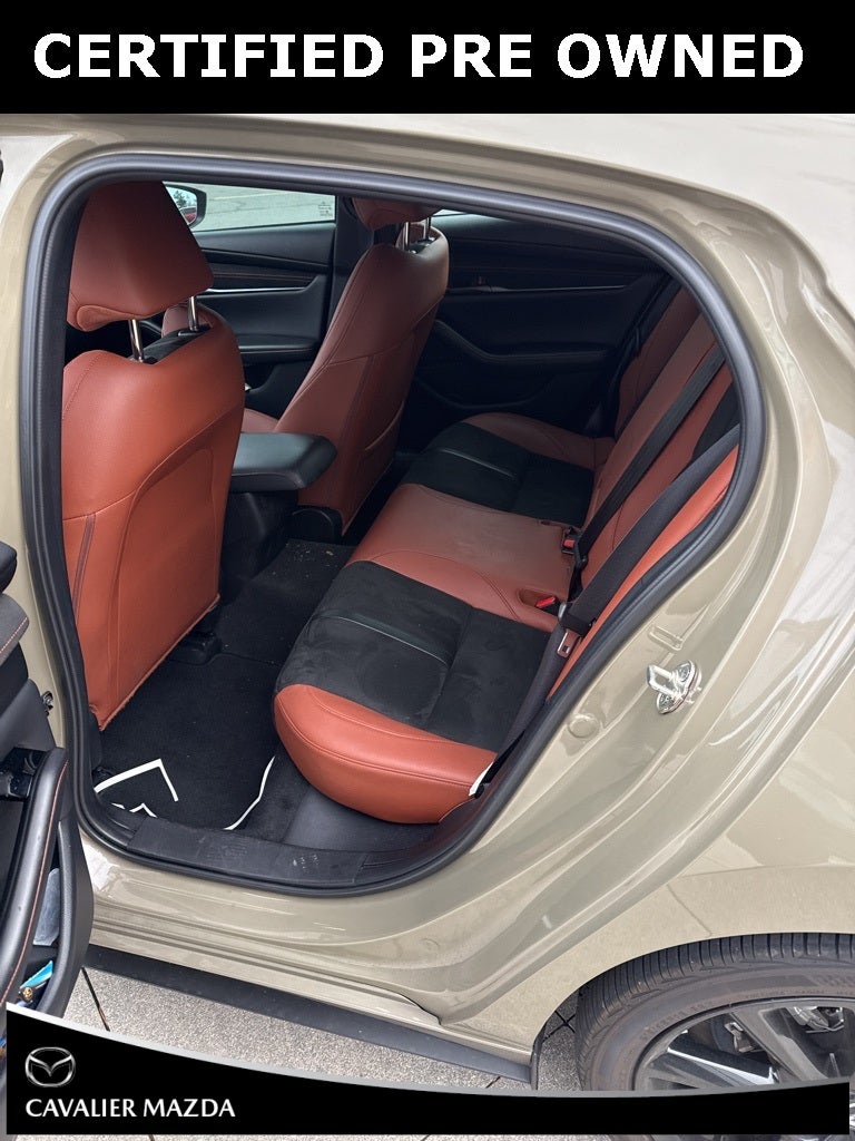 2024 Mazda Mazda3 2.5 Carbon Turbo Certified. Zircon Sand Metallic AWD 6-Speed Automatic 2.5L I4 4-Wheel Disc Brakes, 8 Speakers, ABS brakes, Air Conditioning, Alloy wheels, AM/FM radio, Auto High-beam Headlights, Automatic temperature control, Black Lug Nuts & Black Wheel Locks, Brake assist, Bumpers: body-color, Cargo Tray, Compass, Delay-off headlights, Driver door bin, Driver vanity mirror, Dual front impact airbags, Dual front side impact airbags, Electronic Stability Control, Emergency communication system: Mazda Connected Services (3-year complimentary trial included), Exterior Parking Camera Rear, Front anti-roll bar, Front Bucket Seats, Front Center Armrest, Front dual zone A/C, Front reading lights, Front wheel independent suspension, Fully automatic headlights, Heated door mirrors, Heated Front Bucket Seats, Heated front seats, Illuminated entry, Knee airbag, Leather Shift Knob, Leather steering wheel, Leatherette Seat Trim, Low tire pressure warning, MAZDA CONNECT Infotainment System, Memory seat, Occupant sensing airbag, Outside temperature display, Overhead airbag, Overhead console, Panic alarm, Passenger door bin, Passenger vanity mirror, Power door mirrors, Power driver seat, Power moonroof, Power steering, Power windows, Radio data system, Radio: AM/FM/HD Audio System, Rain sensing wipers, Rear seat center armrest, Rear side impact airbag, Rear window defroster, Rear window wiper, Remote keyless entry, Speed control, Speed-sensing steering, Split folding rear seat, Spoiler, Steering wheel mounted audio controls, Tachometer, Telescoping steering wheel, Tilt steering wheel, Traction control, Trip computer, Turn signal indicator mirrors, Variably intermittent wipers, Wheels: 18 x 7J Aluminum Alloy.