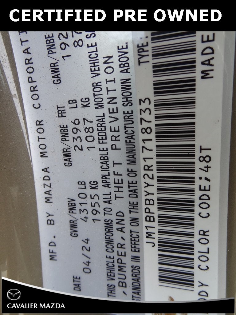2024 Mazda Mazda3 2.5 Carbon Turbo Certified. Zircon Sand Metallic AWD Automatic 2.5L I4 4-Wheel Disc Brakes, 8 Speakers, ABS brakes, Air Conditioning, Alloy wheels, AM/FM radio, Auto High-beam Headlights, Automatic temperature control, Black Lug Nuts & Black Wheel Locks, Brake assist, Bumpers: body-color, Cargo Tray, Compass, Delay-off headlights, Driver door bin, Driver vanity mirror, Dual front impact airbags, Dual front side impact airbags, Electronic Stability Control, Emergency communication system: Mazda Connected Services (3-year complimentary trial included), Exterior Parking Camera Rear, Front anti-roll bar, Front Bucket Seats, Front Center Armrest, Front dual zone A/C, Front reading lights, Front wheel independent suspension, Fully automatic headlights, Heated door mirrors, Heated Front Bucket Seats, Heated front seats, Illuminated entry, Knee airbag, Leather Shift Knob, Leather steering wheel, Leatherette Seat Trim, Low tire pressure warning, MAZDA CONNECT Infotainment System, Memory seat, Occupant sensing airbag, Outside temperature display, Overhead airbag, Overhead console, Panic alarm, Passenger door bin, Passenger vanity mirror, Power door mirrors, Power driver seat, Power moonroof, Power steering, Power windows, Radio data system, Radio: AM/FM/HD Audio System, Rain sensing wipers, Rear seat center armrest, Rear side impact airbag, Rear window defroster, Rear window wiper, Remote keyless entry, Speed control, Speed-sensing steering, Split folding rear seat, Spoiler, Steering wheel mounted audio controls, Tachometer, Telescoping steering wheel, Tilt steering wheel, Traction control, Trip computer, Turn signal indicator mirrors, Variably intermittent wipers, Wheels: 18 x 7J Aluminum Alloy.